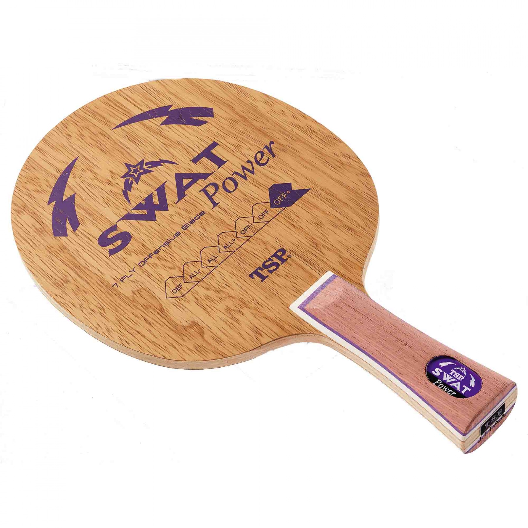 Das Swat Power ist das schnellste Modell des japanischen Bestsellers TSP Swat. Dieses moderne, siebenschichtiges Offensivholz ist das perfekte Werkzeug für den ambitionierten Topspinspieler. Das japanische TSP-Entwicklungsteam kombinierte dabei die vier dünnen Außenfurniere mit 3 schnellen und etwas härteren Innenfurniere, um die ausgezeichneten Beschleunigungswerte und den hohen Ballabsprung zu erreichen. Die daraus resultierende Stabilität und Power sind exakt die Eigenschaften, die Topspieler für ein aggressives und schnelles Offensivspiel bevorzugen. Wie alle Hölzer der Swat-Serie besticht auch das Swat Power mit einem enormen Spinpotential und einer überzeugenden Verarbeitungsqualität. Tempo: 103 Kontrolle: 85 Gewicht: ca. 90g Eignung: OF Furniere: 7